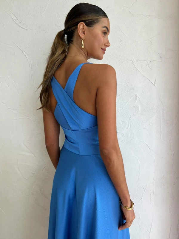 Coco girls are coveting the One Fell Swoop Emmeline Maxi in Ultramarine to rejuvenate their formal occasion ensembles. Crafted from a mid-weight fabrication with a textured finish, this fit and flare midi dress features a plunging neckline and complimentary twist detailing before falling into an asymmetric midi length skirt. With the panelled racer-back styling, Coco Girls love this electric blue Midi dress for birthday celebrations, date nights and twilight cocktails. DETAILS & CARE Fabric: 100% Polyester – Deep V-neckline with thin rouleau straps – Micro interlocking, twist feature tailored to the waistline under the bust – Panelled racer-style back – Mid-length skirt with asymmetrical hem – Fluid bottom skirt – Invisible zip to right side seam – Adhesive bra appropriate – Satin textured fabrication, medium weight, non-sheer, non-stretch – Unlined, slight bubble texture Care Instructions: Cold hand wash, dry cleanable. Our Coco Girl Eden wears a Size AU 8 / Small Eden's Height in 175cm COCO STYLING TIP Complete this special occasion look with the Alias Mae Molly Heel in Cream, Reliquia Telde Necklace in Gold, Reliquia Telde Earrings in Gold, Porter Wave Ring Set in Gold, Porter Celestial Ring, Porter Pond Bangle in Gold and the Arms of Eve Helios Cuff Bracelet in Gold.