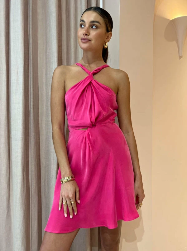 The Esme Mini Dress in Hyacinth is a bold and bright mini moment from One Fell Swoop. Crafted from a mid-weight fabrication with a sand wash finish, this mini dress features a high twisted neckline to flatter your décolletage, gentle gathers through the bodice and waist cut outs before falling into a soft mini length hemline.With the statement low cut back detailed with ruched panels and thin rouleau straps, this mini dress is coveted by Coco Girls for birthday celebrations, cocktail hour and wedding festivities. DETAILS & CARE Fabric: 60% Cupro 40% Viscose- Medium to light weight fabrication with a sand wash finish- High neckline with twist feature- Central twist feature at waistline- Adjustable tie back with ruching detail- Exposed back; cut out- Mini length skirt; A-line silhouette with straight hemline- Invisible zip to centre back- Suitable for an Adhesive braCare Instructions: Cool Gentle Hand Wash, Treat With Care, Dry Clean With CarePlease note: The vintage finish on this garment gives a soft, chamois-like feel and lustre. The occasional variations are no way to be considered a flaw; it is characteristic of the treatment and gives this fabric its unique handle and beauty.Our Coco Girl Eden wears a Size AU 8 / SmallEden's Height is 175cm COCO STYLING TIP Finish with the Alias Mae Ari Heels in Cream, Porter Heirloom Bangle 6mm in Gold, Amber Sceats Hunter Bracelet in Gold, Porter Harp Ring in Gold, Porter Pond Ring in Gold, Reliquia Trending Upwards Hoops in Gold, Porter Baby Link Bracelet in Gold and the Porter Triple Heirloom Ring in Gold.