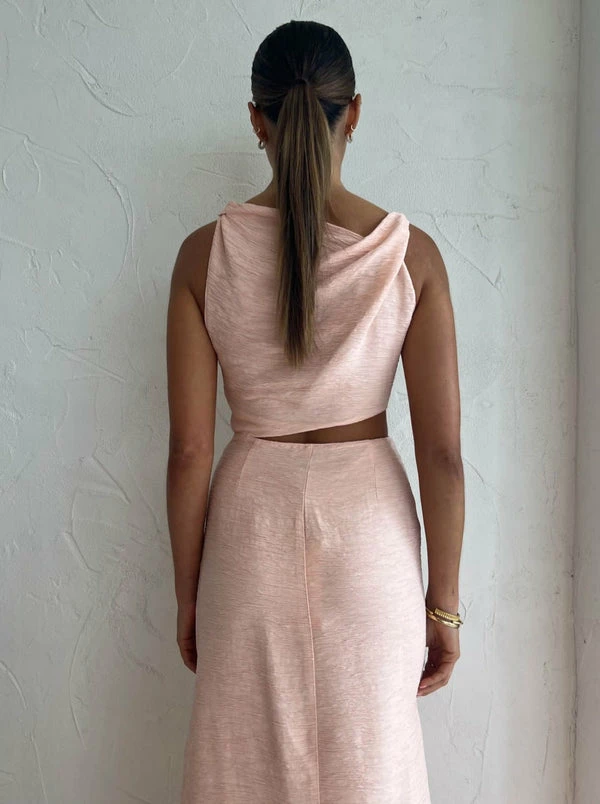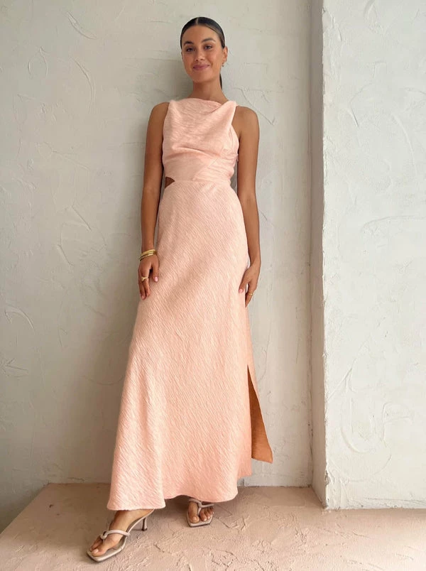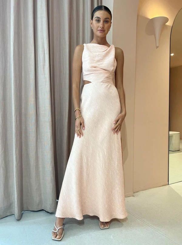 Raise a glass this party season with the elegance of the One Fell Swoop's Florence Maxi Dress in Blossom.Crafted from a mid-weight fabrication with a luxe gathered textured finish, this maxi dress features a high neckline with twisted shoulder strap that creates gentle draping across the bodice, a fitted waist and is finished with a soft maxi skirt with a hemline split that runs up to mid-thigh.With the statement-making waist cutout and flattering bias cut skirt, this elegant maxi dress is the perfect pairing for wedding celebrations, bridesmaid dresses and formal soirees. DETAILS & CARE Fabric: 83% Rayon 17% Cotton- Medium weight fabrication with gathered textured finish- High neckline- Asymmetrical neckline, twisted right strap- Soft drape across top bodice- Fitted waistline- Tailoring seams under the bust and across waistline- Cut out to the left- Maxi length skirt with thigh high split- Bias cut skirt with straight hemline- invisible zip at right-side seam- Suitable for a strapless braCare Instructions: Cold Gentle Hand Wash with Neutral Detergent, Low SpinOur Coco Girl Eden wears a Size AU 8 / SmallEden's Height is 175cm COCO STYLING TIP Complete this special occasion look with the Alias Mae Baz Heels in Cream, Porter Pond Bangle in Gold, Porter Heirloom Bangle 6mm in Gold, Porter Pond Ring in Gold, Porter Paris Huggies and the Porter Wave Ring Set in Gold.