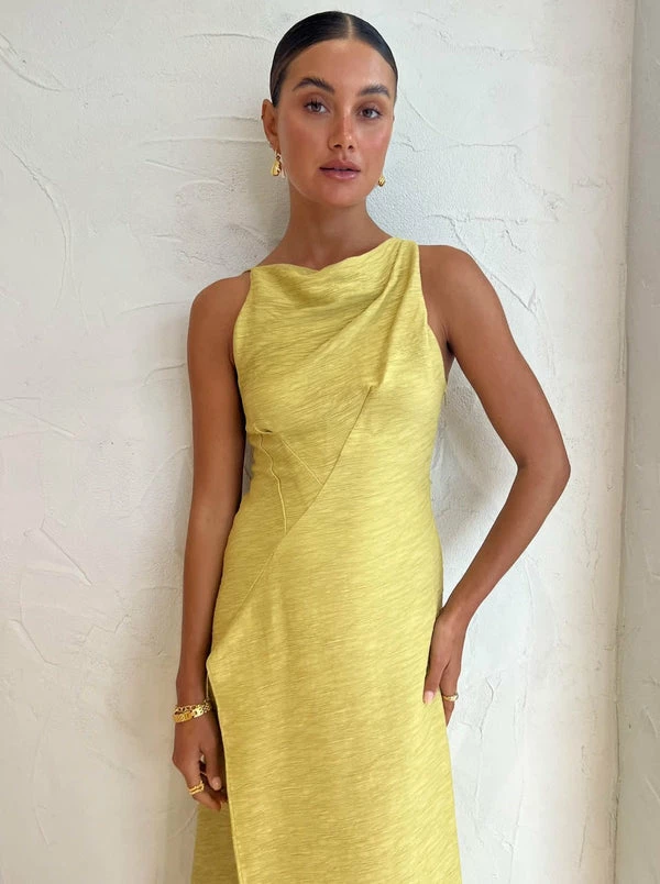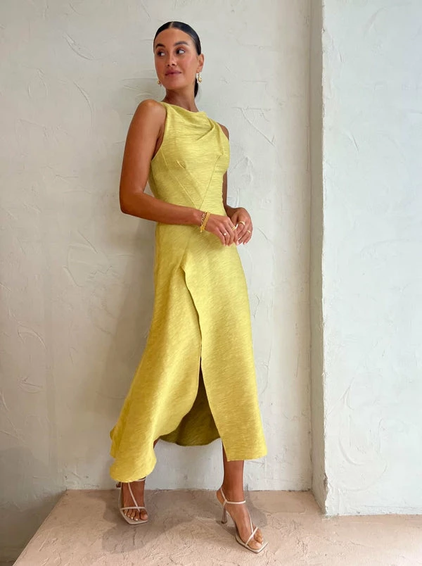 Get that Coco glow with the Frida Midi in Golden Straw by One Fell Swoop. Crafted from a medium-weight fabrication with a gathered textured finish, this midi dress features a high asymmetrical neckline, soft draping across the body and straps with pleating details. Cascading into a mid-length skirt with an alluring left-baring split, Coco girls love the Frida for birthday celebrations, wedding festivities and black tie events. DETAILS & CARE Fabric: 83% Rayon 17% Cotton- High neckline- Asymmetrical neckline, twisted right strap- Soft drape across the top bodice- Tailoring seams under the bust and across the waistline- Asymmetrical straps; one thin, one thick with pleating detail- Mid-length skirt with left baring split- Suitable for a strapless bra- Medium-weight fabrication with a gathered textured finishCare Instructions: Cool Gentle Hand Wash, Treat With Care, Dry Clean With CareOur Coco Girl Eden wears a Size AU 8 / SmallEden's Height is 175cm COCO STYLING TIP Complete this glamorous look with the Alias Mae Molly Heel in Cream, Amber Sceats Grande Helena Ring, Amber Sceats Diana Ring in Gold, Arms of Eve Textured Ring in Gold, Amber Sceats Emma Earrings in Gold, Amber Sceats Coco Bracelet in Gold and the Porter Baby Link 2.0 Bracelet in Gold.