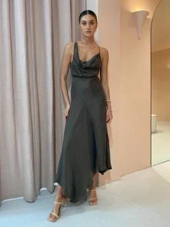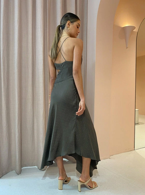 Add a stylistic addition to your wardrobe with One Fell Swoop’s Josephine Dress in Lotus Suede. Synonymous with One Fell Swoops drapery, this Midi is thoughtfully crafted from a luxurious black fabrication with a slight texture. Featuring a draped neckline crafted with two cami straps that fall in a cross body shape it transcends into a fluid asymmetric midi skirt. Designed to cinch the waist and detailed with a flattering cutout, this midi is the perfect silhouette for formal occasions and wedding celebrations. DETAILS & CARE Fabric: 70% Cupro 30% Viscose – Draped neckline – Fitted silhouette – Bias cut – Midi length – Unlined – Shoestring straps that join at centre back- Invisible zip closure at side Care Instructions: Cool gentle hand wash. Do not bleach or wring. Do not tumble dry. Dry flat. Warm iron on the reverse side. Dy clean with care. Our Coco girl Eden wears a Size 8 AU / Small.Eden's Height is 175cm COCO STYLING TIP Complete this elegant moment with Alias Mae Cassie Heel in Natural, Reliquia Baby Coralia Earrings in Gold, Arms Of Eve Rae Chain Necklace in Gold, Porter Frill Cuff in Gold, Porter Pond Bangle in Gold and Porter Bubble Ring in Gold.
