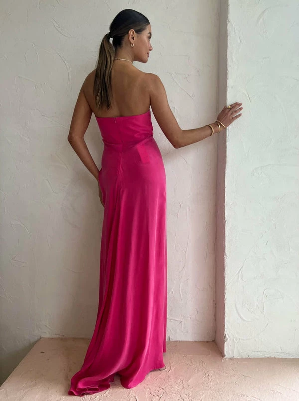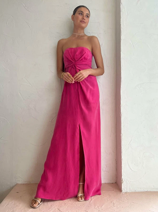 The Tellus Maxi in Hyacinth from One Fell Swoop is draped to perfection for your upcoming occasion calendar. Crafted from a luxurious mid-weight sandwash finished fabrication, this strapless maxi dress skims and flatters with a fitted boned bodice and statement making central twist detail that results in flattering draping across the torso. With the bold and bright hue and quintessential drape detailing, this maxi dress is the perfect plus one to every special occasion in your calendar, from wedding festivities through to black tie celebrations. DETAILS & CARE Fabric: 60% Cupro 40% Viscose- Medium to light weight fabrication with a sand wash finish – Strapless neckline- Lined boned bodice- Central twist knot detail under the bust- Maxi length skirt with central split- Full length maxi skirt- Central split- Concealed zip to the centre back- Strapless bra appropriate Care Instructions: Cool Gentle Hand Wash, Treat With Care, Dry Clean With CarePlease note: The vintage finish on this garment gives a soft, chamois-like feel and lustre. The occasional variations are no way to be considered a flaw; it is characteristic of the treatment and gives this fabric its unique handle and beauty.Our Coco Girl Eden wears a Size AU 8 / SmallEden's Height is cm COCO STYLING TIP Complete this glamorous look with the Alias Mae Zi Heels in Cream, Porter Heirloom Bangle in Gold, Porter Pond Bangle in Gold, Porter Frill Cuff in Gold, Porter Pond Ring in Gold, Porter Pairs Huggies, Porter Wave Ring Set in Gold and the Porter Baby Celestial Necklace in Gold.