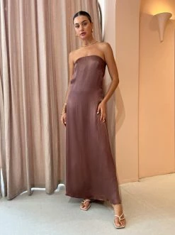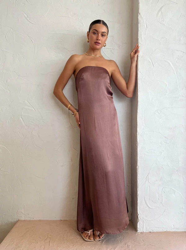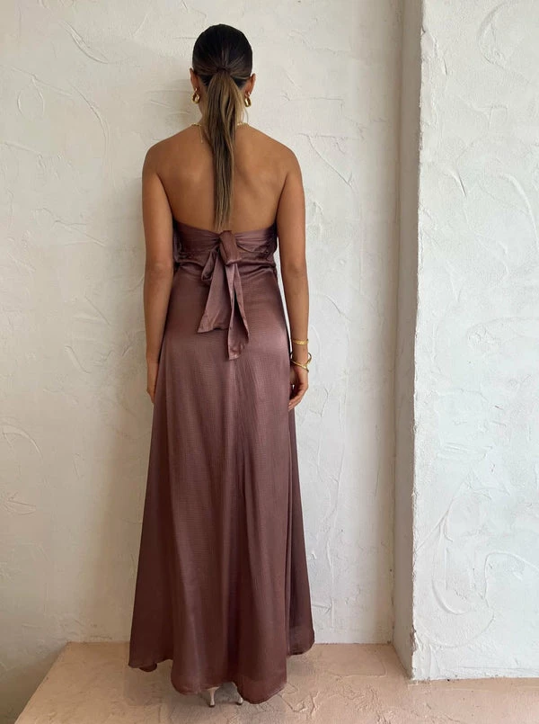 ROAME capture a vision of 90s Hollywood glamour with the Arch Dress in Cocoa. Sleek and sophisticated, this strapless maxi gown is crafted from a lustrous seer-sucker Viscose fabrication in Cocoa. Tailored through the bodice, it fastens with a centre back zip closure before falling gracefully to an A Line floor length skirt. Not without statement, it's unexpected self-tie bow at the back will have crowds turning to admire at your next formal or black tie occasion. DETAILS & CARE Fabric: Main 76% Viscose 24% Eco Vero Lining 76% Viscose 24% Eco Vero – Strapless maxi dress – Centre back zip closure – Elasticated under-bust – Strapless bra friendly – Lined – Front left leg split – Self-tie back bow – Seer-sucker texture Our Coco girl Eden wears a size AU 8 / small. Eden’s height is 175cm. COCO STYLING TIP For your next special occasion, style with the Alias Mae Baz Heel in Cream, Porter Pond Ring in Gold, Porter Wave Ring Set in Gold, Reliquia Trending Upwards Hoops in Gold, Arms of Eve Rae Chain Necklace in Gold, Porter Pond Bangle in Gold, Arms of Eve Helios Cuff Bracelet in Gold and the Porter Heirloom Bangle 6mm in Gold.
