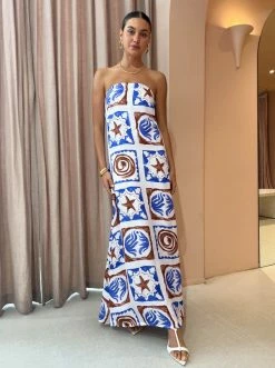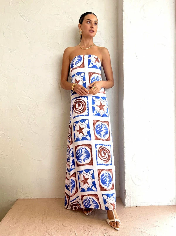 Glide gracefully through sun-kissed days into salty balmy evenings with the bespoke ROAME Arch Dress in Roame Tiles. Designed to wear with ease, this strapless maxi dress is crafted from a lightweight seer-sucker textured Viscose blend. Falling softly to an A line hem with a left leg split, it fastens with a centre back zip closure and a self-tie back bow. A vision of Mediterranean Summers, the Arch Dress is detailed with oceanic inspired painterly motifs that will spark effortless conversation through your upcoming calendar occasions. DETAILS & CARE Fabric: Main 76% Viscose 24% Eco Vero Lining 76% Viscose 24% Eco Vero – Strapless maxi dress- Elasticated under-bust – Centre back zip closure- Self-tie back bow – Front left leg split – Seer-sucker texture Our Coco girl Eden wears a size AU 8 / small. Eden’s height is 175cm. COCO STYLING TIP Complete this glamorous look with the Arms of Eve Rae Chain Necklace in Gold, Porter Pond Bangle in Gold, Arms of Eve Helios Cuff Bracelet in Gold, Porter Heirloom Bangle 6mm in Gold, Camilla and Marc Vigo Heel in Ivory, Porter Pond Ring in Gold, Porter Wave Ring Set in Gold and the Reliquia Over and Over Earrings in Gold.