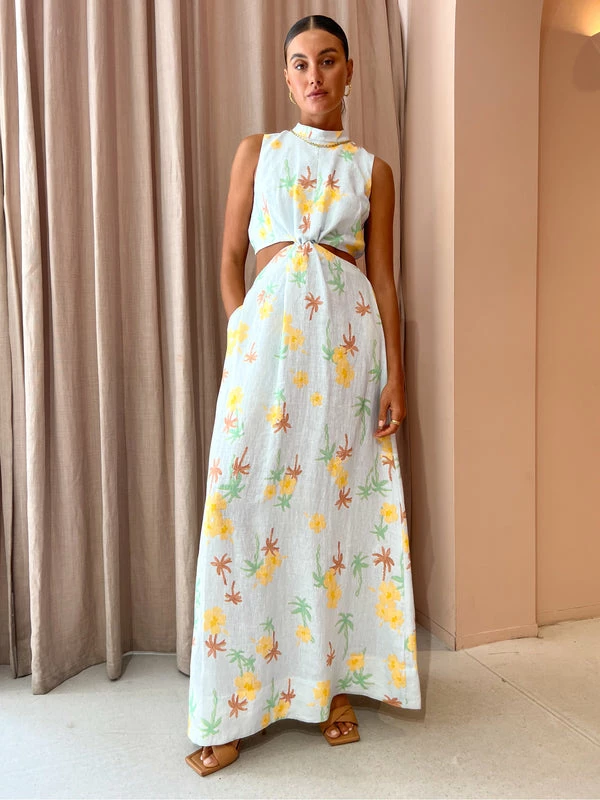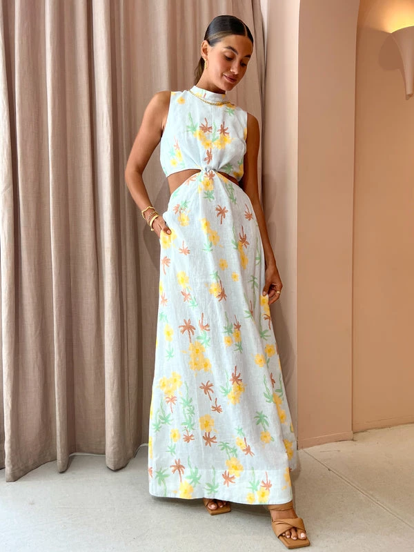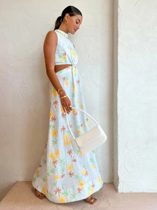 Make the most of sun-drenched days with the Loren Maxi Dress in Palmero by ROAME.Crafted in a pure linen fabrication, this exclusive maxi dress features a mock neckline, elasticated waist detailing and is defined by a statement fixed knot at the centre front before falling to a relaxed full-length skirt that flows effortlessly to the floor.Welcome sun-seeking prints and effortlessly easy silhouettes into your Coco wardrobe with this summer standout maxi dress. DETAILS & CARE Fabric: 100% Linen- Pure linen fabrication- Fully lined- Fixed-knot detail- Elasticated bodice hem & waistband- Cut-out waist panels- Maxi-length skirt- Print exclusive to ROAMECare Instructions: Cold gentle machine wash. Dry cleanable. Our Coco girl Eden wears a size AU 8 / small.Eden’s height is 175 cm. COCO STYLING TIP Complete the look with the Alohas Twist Strap in Camel, Amber Sceats Bella Earrings in Gold, Porter Chunky Belcher Necklace 2.0 in Gold, Porter Chunky Belcher Bracelet in Gold, Amber Sceats Lane Ring in Gold, Amber Sceats Electra Ring Set in Gold and the Amber Sceats Helena Bracelet in Gold.