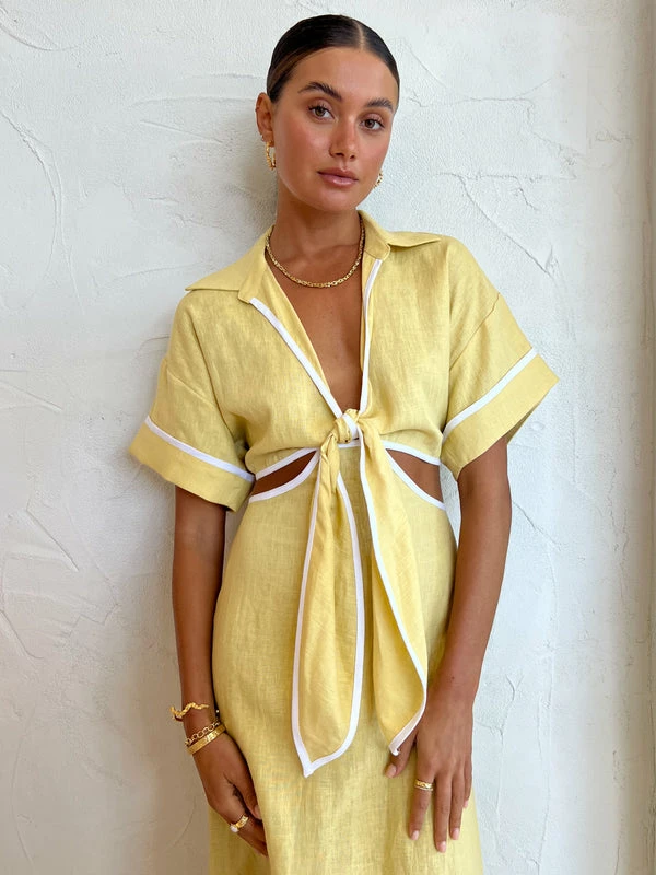 Designed with the Coco traveller in mind, spend your summer in the Parque Dress in Butter by ROAME. Delicately crafted in a pure linen fabrication, this pungle neckline midi dress features a front tie, open waist and optical white bind detailing. Fall in love with the effortless silhouette of this midi dress for all your day-to-dusk summer dressing. DETAILS & CARE Fabric: 100% Linen- Pure linen fabrication- Contrast bind detail- Centre front tie- Two-piece collar- Elasticated bodice hem & fixed waist with invisible zipper- Cut out waist panels- Midi lengthCare Instructions: Cold gentle machine wash. Dry cleanable. Our Coco girl Eden wears a size AU 8 / small.Eden’s height is 175 cm. COCO STYLING TIP For special occasion styling, complete the look with the James Smith Medena Sandal in Nude, Amber Sceats Bella Earrings in Gold, Porter Chunky Belcher Necklace 2.0 in Gold, Porter Chunky Belcher Bracelet in Gold, Amber Sceats Lane Ring in Gold, Amber Sceats Electra Ring in Gold and the Amber Sceats Helena Bracelet in Gold.