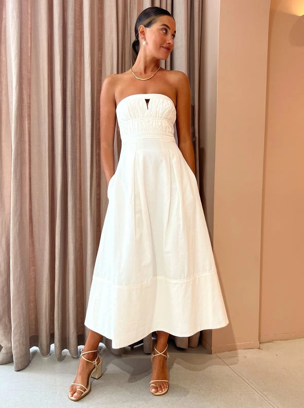 Complete your day-to-night wardrobe with Shona Joy's effortless Akua Strapless Bustier Midi Dress in Coconut. Crafted from a Cotton Linen blend, this flattering strapless midi dress features a ruched bust detail, side pockets and finished with a flared circle midi-length skirt.Adored for its feminine silhouette and fresh colour-way, this midi dress is perfect for garden parties, long lunches and birthday celebrations. DETAILS & CARE Fabric: Main: 65% Cotton, 35% Linen Lining: 100% Cotton- Premium textured Cotton linen- Strapless neckline- Ruched bodice with cut-out detail- Wide front pleats- Invisible back zip- Side pockets- Circle hem midi length skirt- Medium weight, non-stretchy woven- LinedCare Instructions: Cold hand wash. Dry Cleanable. Our Coco girl Eden wears a size AU 8 / small.Eden’s height is 175cm. COCO STYLING TIP Complete this glamorous look with the Alohas Grace Heel in Corn Ivory, Amber Sceats Valletta Earrings in Gold, Porter Chunky Belcher Bracelet in Gold, Porter Baby Link 2.0 Bracelet in Gold, Arms of Eve Rae Chain Necklace in Gold, Amber Sceats Diana Ring in Gold and the Amber Sceats Grande Helena Ring in Gold.
