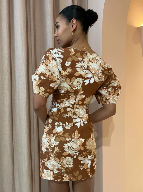 Get ready for endless summer soirées with Shona Joy's Capucine Lace Front Lantern Sleeve Mini Dress in Almond/Multi. Thoughtfully crafted from a luxurious blend, this mini is printed in a tonally feminine almond multi floral print. Cut to a mini length silhouette, this figure flattering silhouette features a structured bodice, puff sleeves, square neckline and drawstring tie the bust detail that extends into a halter neckline. Adored for it's playful tie and cutouts, this mini dress will complete your birthday parties, ladies lunches and sunset soirees with styling versatility. DETAILS & CARE Fabric: Main: 55% Linen, 45% Viscose Lining: 97% Cotton, 3% Elastane – Mini dress – Puff sleeve – Square neckline – Panelled bodice – Drawstring tie detail through the bust – Halter tie neckline Our Coco girl Eden wears a Size 8 AU / Small.Eden's Height is 175cm. COCO STYLING TIP Complete with the Alias Mae Cassie Heel in Natural and add a touch of gold with the Amber Sceats Hudson Bracelet in Gold, Amber Sceats Coco Bracelet in Gold, Porter Pond Ring in Gold, Porter Margot Ring in Gold and Reliquia Telde Earrings in Gold. For a day time look pair with the Coco x Velcro Supergas.