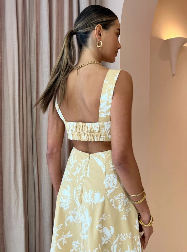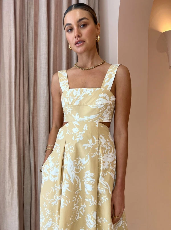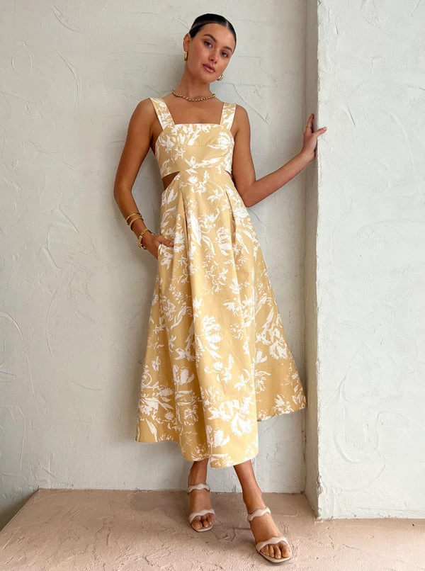 Embrace the California Sun with the Farrah Cut Out Midi Dress in Sand/ivory from Shona Joy. Crafted in 100% Organic Cotton, this flattering midi dress features a square neckline with wide straps, an elasticated ruched back for comfort and cut out detailing at side and back. Adored for the flattering silhouette, this midi dress will take you from day to dusk with ease. DETAILS & CARE Fabric: 100% GOTS Certified Organic Cotton- Exclusive Farrah print- Square neckline with wide straps- Elasticated ruched back- Cut out detail at sides and back- Invisible back zip- Flared midi length skirt- Medium weight, non-stretchy wovenOur Coco girl Eden wears a size AU 8 / small.Eden’s height is 175cm. COCO STYLING TIP Complete the look with the Alias Mae Lin Heels in Cream, Porter Chunky Belcher Necklace 2.0 in Gold, Porter Frill Cuff in Gold, Reliquia Trending Upwards Hoops in Gold, Porter Heritage Bracelet in Gold, Porter Pond Bangle in Gold and the Porter Heirloom Bangle 6mm in Gold,
