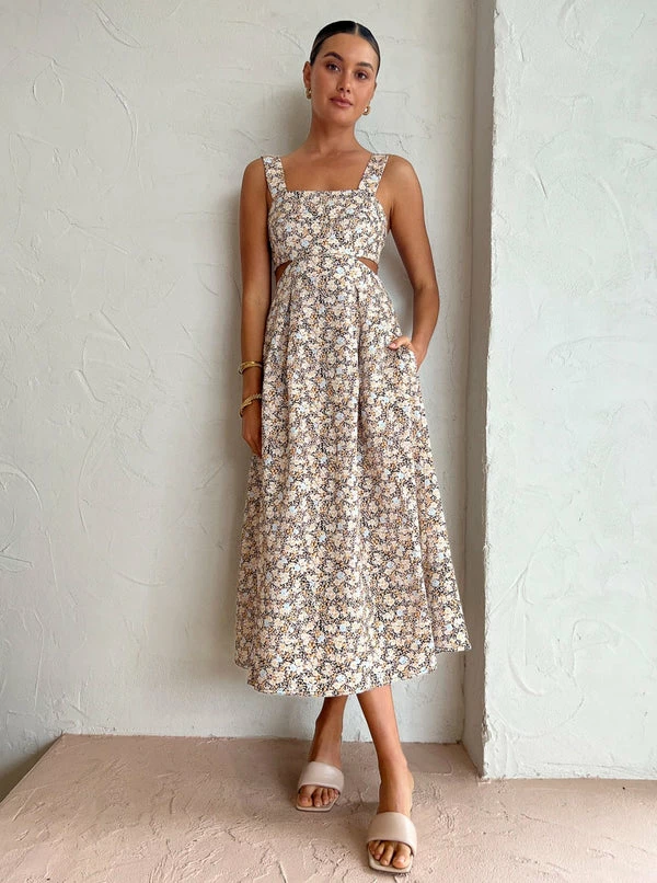 Embrace sophisticated femininity with the Heather Cut Out Midi Dress in Black/Multi from Shona Joy. Crafted in a linen blend fabrication, this flattering midi dress features a square neckline with wide straps, an elasticated ruched back for comfort and cut out detailing at side and back. With the sophisticated modernity of this midi dress, Coco girls love this silhouette for garden weddings, long lunches with friends and birthday celebrations. DETAILS & CARE Fabric: 55% Linen 45% Viscose- Exclusive Heather print- Premium linen blend fabric- Square neckline with wide straps- Elasticated ruched back- Cut out detail at sides and back- Invisible back zip- Flared midi length skirt- Medium weight, non-stretchy wovenOur Coco girl Eden wears a size AU 8 / small.Eden’s height is 175cm. COCO STYLING TIP For your next special occasion, style with the Alias Mae Ari Heels in Cream, Porter Hailey Twist Necklace in Gold, Reliquia Thalia Ring in pearl/Gold, Porter Spiral Hoops in Gold, Porter Triple Heirloom Ring in Gold, Porter Wave Croissant Ring in Gold, Porter Heirloom Bangle 6mm in Gold, Porter Baby Link Bracelet in Gold, Vieux Chartreaux Sunglasses in Bone and the Brie Leon Mini Chloe Bag in White Brushed Recycled Croc.