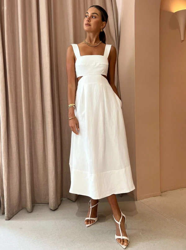 Introducing the timelessly classic Morgan Cut Out Midi Dress in Ivory from Shona Joy.Crafted from a premium Linen blend fabrication, this flattering midi dress features a square neckline with wide straps, an elasticated ruched back for comfort and cut out detailing at side and back.Adored for the flattering and timeless silhouette, this midi dress will be worn on repeat for seasons to come. DETAILS & CARE Fabric: Main: 55% Linen 45% Viscose Lining: 100% Cotton- Midi dress with cut out detail- Premium linen blend fabric- Square neckline with wide straps- Elasticated ruched back- Cut out detail at sides and back- Invisible back zip- Flared midi length skirt- Medium weight, non-stretchy woven- LinedCare Instructions: Cold hand wash separately.Our Coco girl Eden wears a size AU 8 / small.Eden’s height is 175cm. COCO STYLING TIP