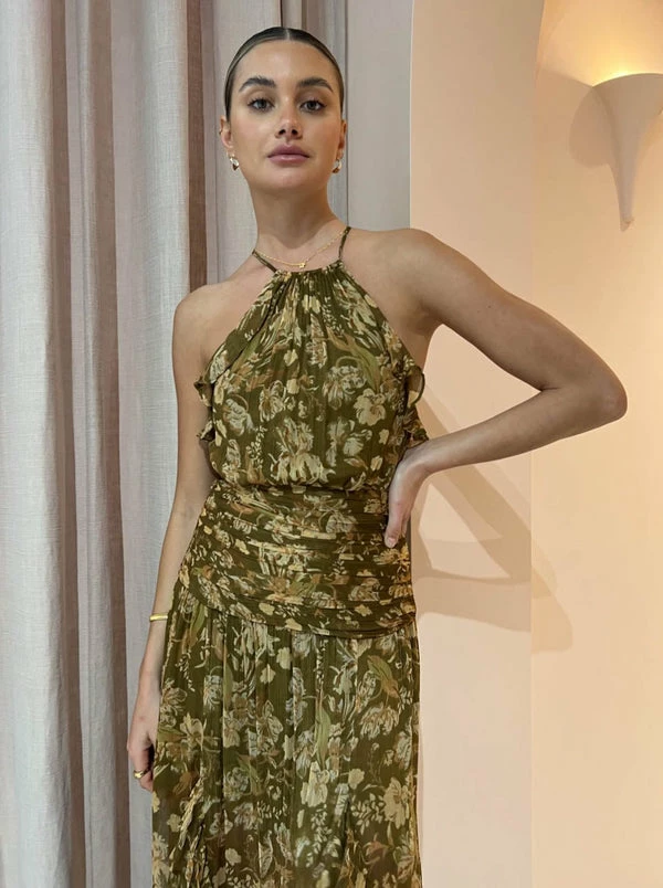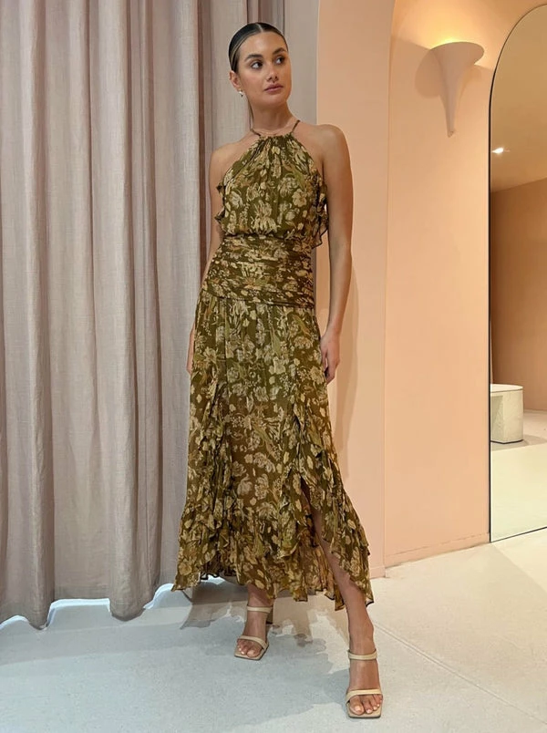 Shona Joy inspires our transeasonal event dressing with the Rosaline Ruched Split Maxi Dress. Thoughtfully crafted from a signature lightweight viscose fabrication, this flattering maxi dress sits high on the neck with a halter style top and softly gathered bust. Detailed with a gathered bodice to accentuate the femme figure before falling softly into a flowing maxi skirt with frill trims. Its free flowing silhouette and side split adds the perfect feminine touch, taking our Coco girls from sunset cocktails to dinner dates and into the weekends. DETAILS & CARE Fabric: Main: 100% Viscose Lining: 100% Polyester – Maxi length- Halter neckline- Adjustable angled rouleau straps - Fitted ruched bodice- Fluid A line hemline- Invisible back zip closure- Side splits - Lined Our Coco girl Eden wears a Size 8 AU / SmallEden's Height is 175cm COCO STYLING TIP For your next special Coco moment, compliment with the beautiful Alias Mae Camelia Heel in Bone, the Amber Sceats Hudson Bracelet in Gold and Reliquia Lucille Earrings in Gold.
