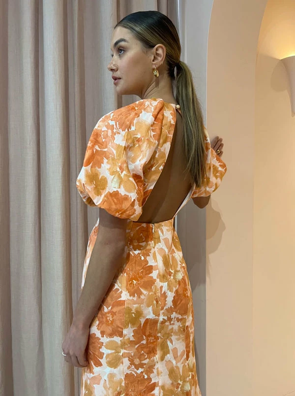 Consider Significant Other's Elena SS Midi Dress in Scarlet Poppy your celebration dress of the season. Delicately crafted from a lightweight linen blend and printed in a warm floral print, this midi dress slips on with ease. Featuring a round neckline and romantic puff sleeves, its tailored through the bodice before falling into a floaty hemline. Detailed with an unexpected back bodice cutout and centre back split for fluidity, make a statement at garden party soirees, long lunches and winery getaways. DETAILS & CARE Fabric: 55% Linen, 45% Viscose Rayon – Midi dress – Accentuated sleeves- Elasticated sleeve opening- Fitted bodice- Open back feature- Invisible back zip- Back button closure- Centre back skirt split Our Coco girl Eden wears a size 8 AU / small. Eden's height is 175cm. COCO STYLING TIP For your next long lunch complete with the Alias Mae Molly Heel in Cream, Reliquia Sevilla Earrings in Gold, Porter Heirloom Bangle in Gold and the Reliquia Raquel Ring in Gold.