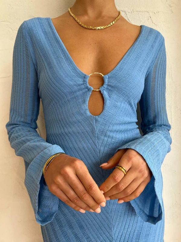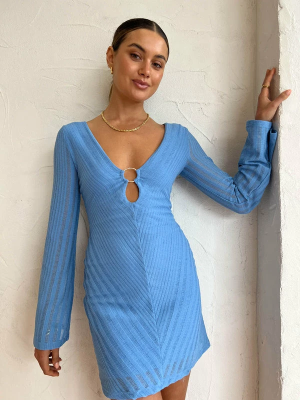 Significant Other has re-invigorated the classic mini with a retro twist in the Eloise Mini Dress in Azure. Designed from a stretch knit fabrication, this fitted mini dress features flared long sleeves and a centre bust cut-out detail with luxe gold hardware.Making a statement with the unique centre bust cut-out detail, Coco girls will be seen wearing this to all their birthday soirees and cocktail occasions. DETAILS & CARE Fabric: Main 95% Polyester, 5% Elastane- Cropped silhouette- Lined- Sleeveless design- Adjustable neck tie- Elastic waistband- Front cut-out detailOur Coco girl Eden wears a size AU 8 / small.Eden’s height is 175 cm. COCO STYLING TIP Complete with the Camilla and Marc Vigo Heel in Ivory, Reliquia Telde Earrings in Gold, Reliquia Telde Necklace in Gold, Porter Frill Cuff in Gold, Porter Pond Bangle in Gold, Reliquia Thalia Ring in Pearl/Gold, Porter Wave Ring Set in Gold, and the Porter Pond Ring in Gold.