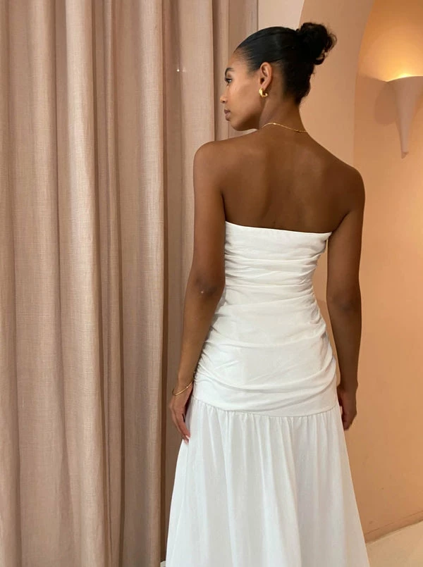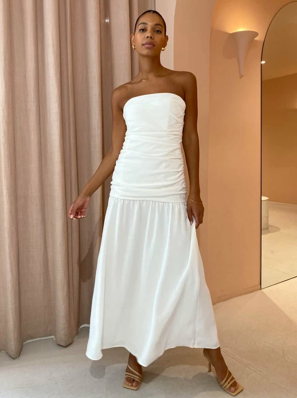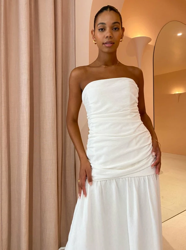 The Cael Gathered Midi Dress in Ivory from SIR. is constructed with classic minimalistic elegance for timeless wear. Designed with a medium weight Italian linen blend in Ivory. This strapless dress is fitted through the gathered bodice before falling into a softly gathered tiered hem from the drop waist. Coco girls adore the Cael Gathered Midi for engagement parties, wedding dresses and birthday celebrations. DETAILS & CARE Fabric: Main 58% Viscose 42% Linen Lining 100% Rayon – Strapless – Light gathers through sides creating drape – Fitted through body – Lightly gathered hem tier – Invisible zipper closure – Medium weight Italian fabric – Fully lined Care Instructions: Dry clean only. Do not bleach. Do not tumble dry. Cool iron. COCO STYLING TIP Finish with the Alias Mae Aspen Heels in Natural, the Porter Tube Bangle 3mm in Gold and Wave Croissant Ring in Gold for that signature elevated touch.