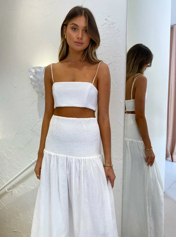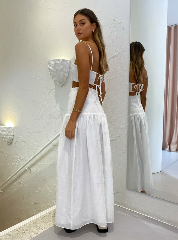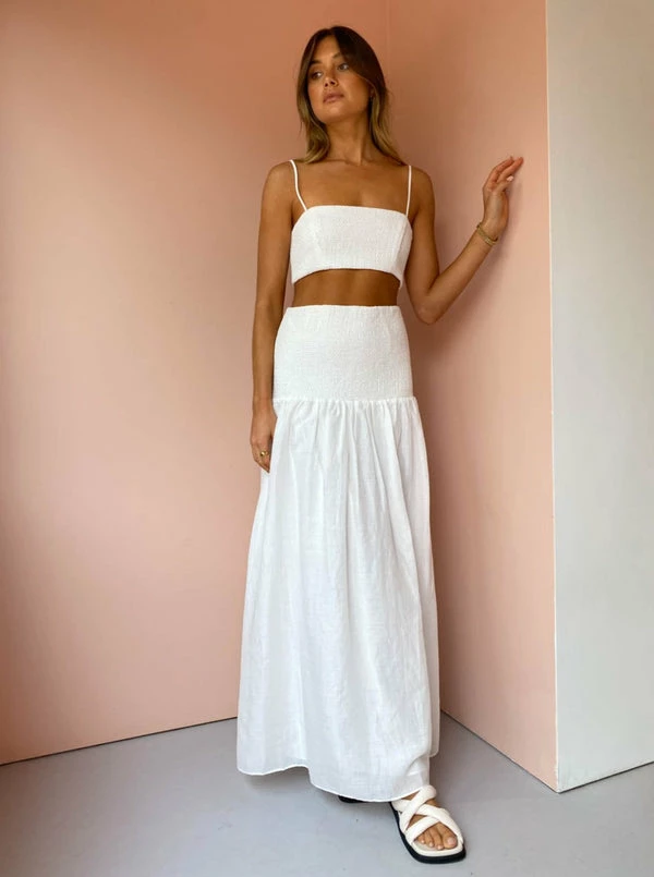 Luxe minimalism is in focus with the Diana Smocked Maxi Skirt in Ivory by SIR.Designed to be worn with ease day to night, this maxi skirt is crafted from a Ramie fabrication in a timeless Ivory hue. Sitting high and fitted on the waist, it features an invisible side zipper closure and is fully lined for comfort.Elevating the Diana with its smocked panel and flattering drop waist design, Coco girls are coveting this maxi skirt for desk to dusk dressing and luxurious getaways. DETAILS & CARE Fabric: Main 100% Ramie Lining 100% Rayon – Smocked panel- Maxi silhouette- Drop waist- Invisible side zip- High waisted Our Coco Girl Eden wears a Size 1 / AU 8 / Small.Eden's height is 175cm.Care Instructions: Dry clean only. Do not bleach. Do not tumble dry. Cool iron COCO STYLING TIP Complete the set with the matching Diana Crop Top in Ivory, styling with the Alohas Slip On Cross Sandals in Ivory and Porter Heritage Bracelet in Gold. Elevate for those special occasions with the Alias Mae Aspen Heels in Natural.