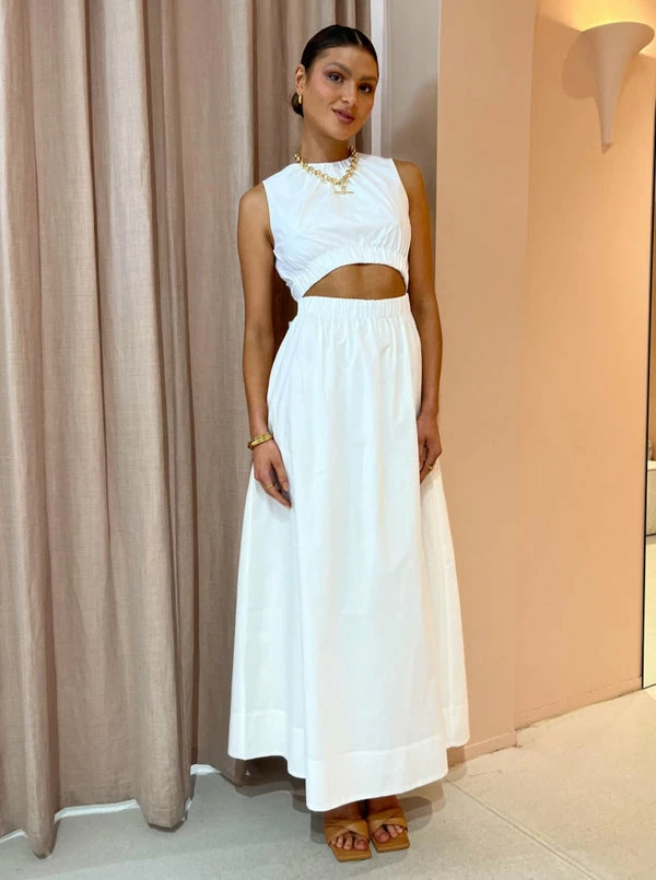 The SIR. Dion Gathered Dress in Blanc is a redefined modern classic.Crafted from a crisp Italian Cotton Poplin, this midi length dress features a statement underbust cutout and is balanced with a voluminous skirt. With the flattering sleeveless silhouette and bow detailing at back, this midi dress is a Coco go-to for brides to-be, long lunches and sea side drinks in the summer sun. DETAILS & CARE Fabric: Main: 100% Cotton Lining: 100% Rayon- Rounded high neck- Sleeveless- Centre front cut out- Elasticated bodice hem and skirt waist- Side seam pockets- Midi length- Lightweight, crisp cotton poplin that holds shape- No stretch through fabric- True to sizeCare Instructions: Dry clean only. Our Coco girl Ella Grace wears a size AU 8 / small.Ella Grace’s height is 176cm. COCO STYLING TIP Complete this look with the Aloha Twist Strap Heel in Camel, Reliquia Maxima Necklace in Gold, Porter Wave Ring Set in Gold, Porter Chunky Belcher Bracelet in Gold, Porter Tear Drop Earrings in Gold, Porter Pond Ring in Gold, Porter Pond Bangle in Gold, and the Vieux Versaille in Bone.