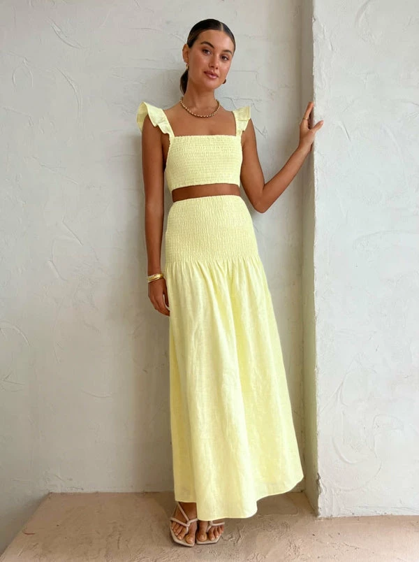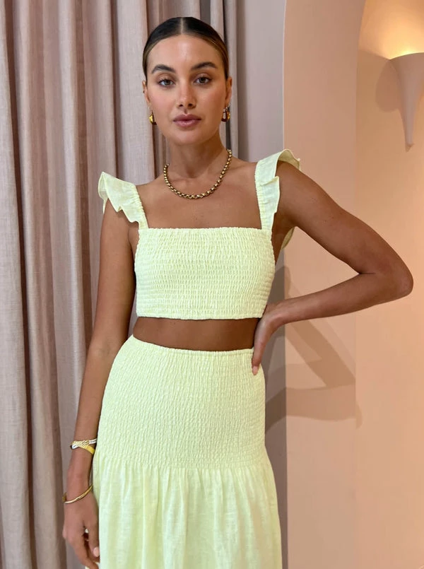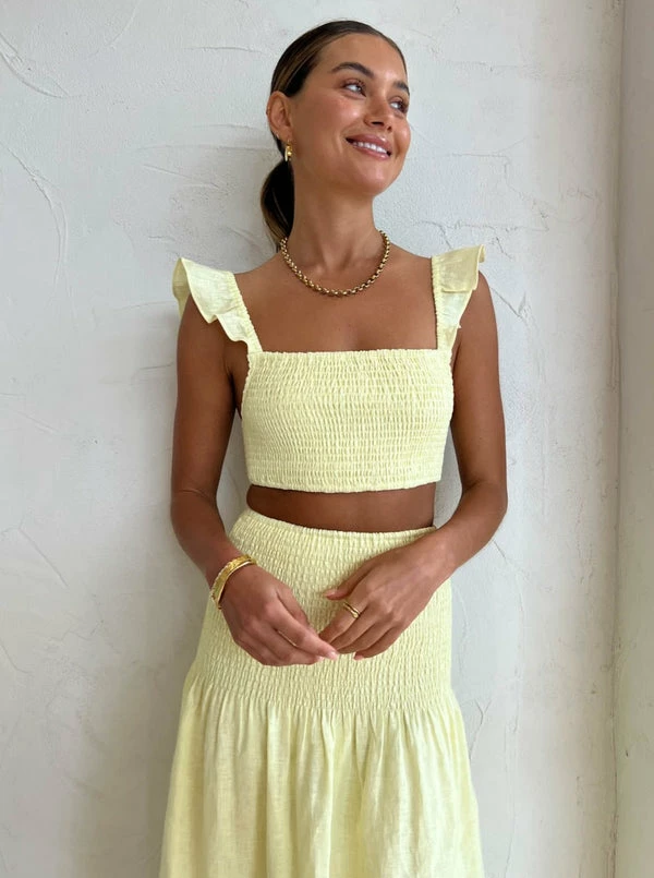 Refresh your resort-wear repertoire with the Francesca Shirred Crop in Butter from SIR. Crafted from a heavyweight luxurious Linen that holds its shape, this cropped length top features a square neckline, a shirred bodice for ease of wear and is finished with frilled shoulder straps. With the sweet silhouette and fresh yellow hue, Coco girls are coveting this statement crop top to elevate their Resort occasion styling for birthday celebrations, wedding events and weekend wanderings. DETAILS & CARE Fabric: Main: 100% Linen Lining: 100% Rayon- Shirred bust- Square neckline- Frilled straps- Elasticated straps- Fully lined- A heavyweight natural fibre linen that is luxurious and holds its shape, limiting creases- Generous stretch through shirring- True to sizeCare Instructions: Dry Clean Only.Our Coco girl Eden wears a size AU 8 / small.Eden’s height is 175cm. COCO STYLING TIP Alias Mae Baz Heel in Cream, Arms of Eve Rae Chain Necklace in Gold, Reliquia Sevilla Earrings in Gold, Porter Pond Bangle in Gold, Porter Wave Ring Set in Gold, Porter Pond Ring in Gold, Amber Sceats Hunter Bracelet in Gold and the Arms of Eve Helios Cuff Bracelet in Gold.