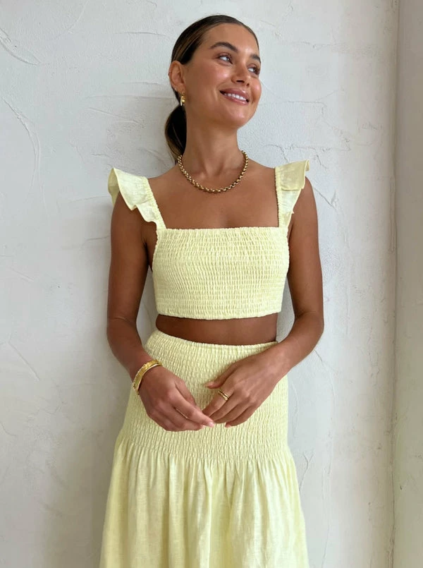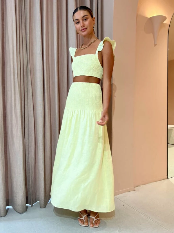 The Francesca Shirred Maxi Skirt in Butter from SIR. is a versatile sunshine silhouette for extra style mileage. Crafted from a heavyweight luxurious Linen that holds its shape, this flattering maxi skirt slips on with ease with a shirred waist and hip area before falling into a A-line skirt.With the statement silhouette and fresh yellow hue, Coco girls are coveting this maxi skirt for all their resort occasion styling. DETAILS & CARE Fabric: Main: 100% Linen Lining: 100% Rayon- Shirred waist and hip- A-line skirt- Maxi length- Slips on- Fully lined- A heavyweight natural fibre linen that is luxurious and holds its shape, limiting creases- Generous stretch through shirring – True to sizeCare Instructions: Dry clean onlyOur Coco girl Eden wears a size AU 8 / small.Eden’s height is 175cm. COCO STYLING TIP Alias Mae Baz Heel in Cream, Arms of Eve Rae Chain Necklace in Gold, Reliquia Sevilla Earrings in Gold, Porter Pond Bangle in Gold, Porter Wave Ring Set in Gold, Porter Pond Ring in Gold, Amber Sceats Hunter Bracelet in Gold and the Arms of Eve Helios Cuff Bracelet in Gold.