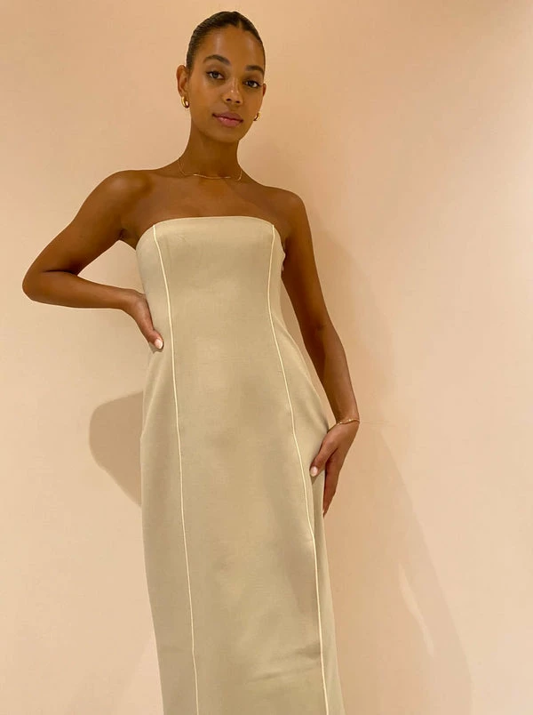 The SIR Monte Strapless Dress in Tan is tailored to perfection for timeless wear. Fitted through the body with internal boning, this strapless midi silhouette is crafted from a signature Italian suiting fabrication that is designed to flatter and form. Minimal finishes including a princes panel seam, contrast trim and front split make this midi a go-to for long lunches, birthday celebrations, cocktails and dinner date occasions. DETAILS & CARE Fabric: Main 53% Polyester 43% Virgin Wool 4% Elastane Contrast 48% Cotton 48% Polyester 4% Spandex Lining 100% Polyester – Internal boning – Midi length – Invisible zipper at side – Bra friendly – Princes panel seam – Contrast trim throughout – Designed to be fitted on the body – Italian suiting – Fully lined- Front split Care Instructions: Do not bleach. Do not tumble dry. Cool iron. Specialty delicate dry clean only. COCO STYLING TIP Complete with the Alias Mae Aspen Heels in Natural, Porter Tube Bangle 3mm in Gold and Wave Croissant Earrings in Gold for long lunch celebrations, dinner dates and cocktail occasions.