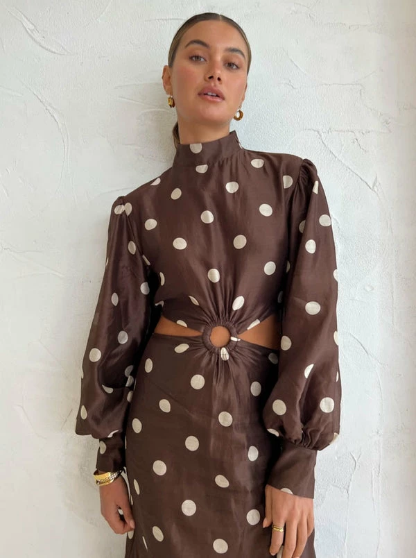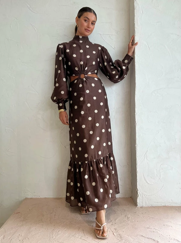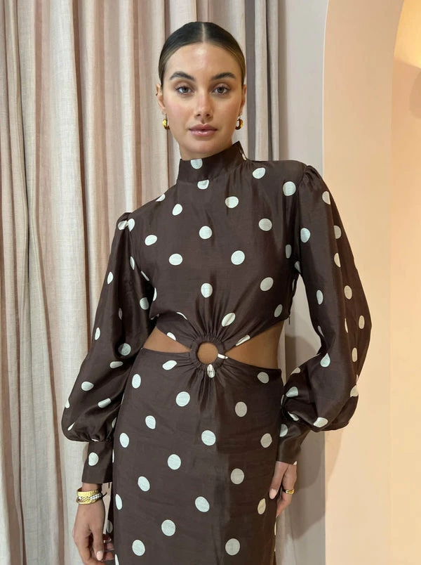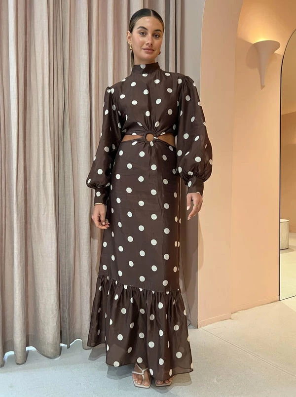 The Vivi Cut Out Maxi Dress in Marlon Polka Dot from SIR. effortlessly fuses old world charm into any celebratory styling. Crafted in a lightweight Cotton Silk blend with a slight sheen, this statement-making high neck maxi dress features a cut-out waist accentuated with a tortoiseshell o-ring detail and puff sleeves before falling into a straight skirt finished with a soft frilled hemline. With the timelessly tonal polka dot print, this long sleeve maxi dress is a season-less style hero for any special occasion in your calendar. DETAILS & CARE Fabric: Main: 79% Cotton 21% Silk Lining: 100% Rayon- Maxi dress – High neck- Long sleeve- Invisible zipper at left shoulder, side bodice and skirt- Tortoiseshell O-ring- Cut out waist- Frilled hem- Fully lined- A lightweight silk cotton blend with a slight sheen- No stretch- True to sizeCare Instructions: Dry clean only. Our Coco girl Eden wears a size AU 8 / small.Eden’s height is 175cm COCO STYLING TIP Alias Mae Baz Heel in Cream, Reliquia Serpa Necklace in Gold /Pearl, Reliquia Sevilla Earrings in Gold, Porter Pond Bangle in Gold, Porter Wave Ring Set in Gold, Porter Pond Ring in Gold, Amber Sceats Hunter Bracelet in Gold and the Arms of Eve Helios Cuff Bracelet in Gold.