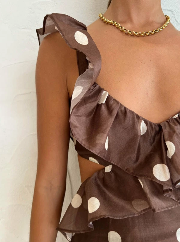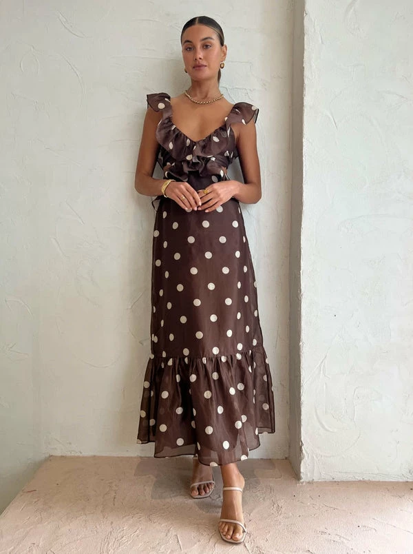 Timelessly tonal, the Vivi Frill Maxi Dress in Marlon Polka Dot from SIR. is a classic silhouette for celebration season. Crafted in a lightweight Cotton Silk blend, this flattering maxi dress features a ruffle plunge neckline with waist cut outs and is finished with a straight skirt with a ruffle hemline.With the exposed back and self tie back bow, this effortless polka dot maxi dress is the perfect plus one for wedding celebrations, formal soirees and birthday celebrations. DETAILS & CARE Fabric: Main: 79% Cotton 21% Silk Lining: 100% Rayon- Frill detail over shoulder and across waist- Plunging bust – Ruffle hem- Centre back zipper at skirt – Back tie detail – Maxi length – Fully lined – A lightweight silk cotton blend with a slight sheen- No stretch – True to sizeCare Instructions: Dry Clean Only.Our Coco girl Eden wears a size AU 8 / small.Eden’s height is 175cm. COCO STYLING TIP Finish the look with the Alias Mae Molly Heel in Cream, Arms of Eve Rae Chain Necklace in Gold, Reliquia Sevilla Earrings in Gold, Porter Pond Bangle in Gold, Porter Wave Ring Set in Gold, Porter Pond Ring in Gold, Amber Sceats Hunter Bracelet in Gold and the Arms of Eve Helios Cuff Bracelet in Gold.