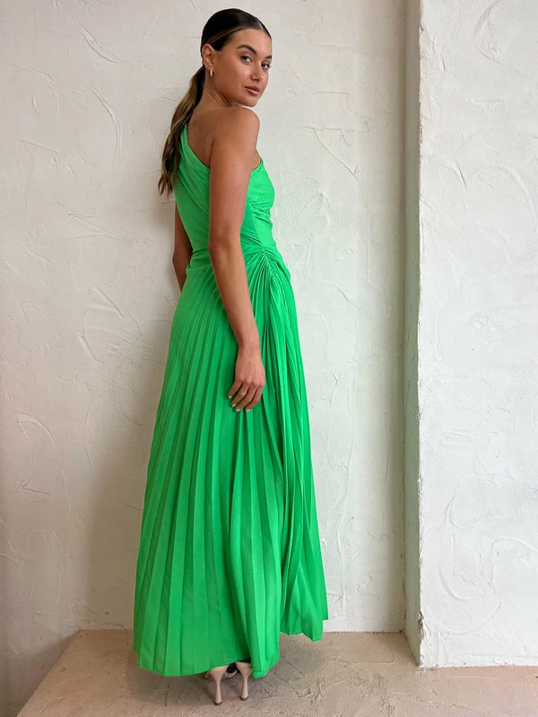 Embrace festive fun and bold colour with the Azalea Gown in Barcelona Green from SONYA.Crafted from a lightweight pleated fabrication, this one shoulder maxi dress features pleats cut on the bias and is artfully gathered on the hip to form and flatter.With the voluminous skirt and timeless silhouette, this maxi dress is the perfect pairing for romantic weddings, garden parties and summertime festivities. DETAILS & CARE Fabric: Main 97% Polyester, 3% Spandex- Maxi length- One shoulder- Pleats cut on the bias- Gathering at the hip- Invisible side zipper- Fully lined on chest and skirtOur Coco girl Eden wears a size AU 8 / small.Eden’s height is 175cm. COCO STYLING TIP Complete the look with the Alias Mae Molly Heel in Cream, the Porter Paris Huggies, the Porter Chunky Belcher Bracelet in Gold, the Arms of Eve Helios Cuff Bracelet in Gold, Porter Wave Ring Set in Gold and the Porter Pond Ring in Gold.