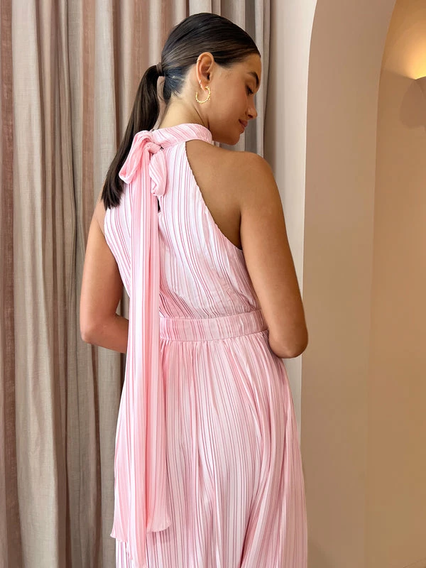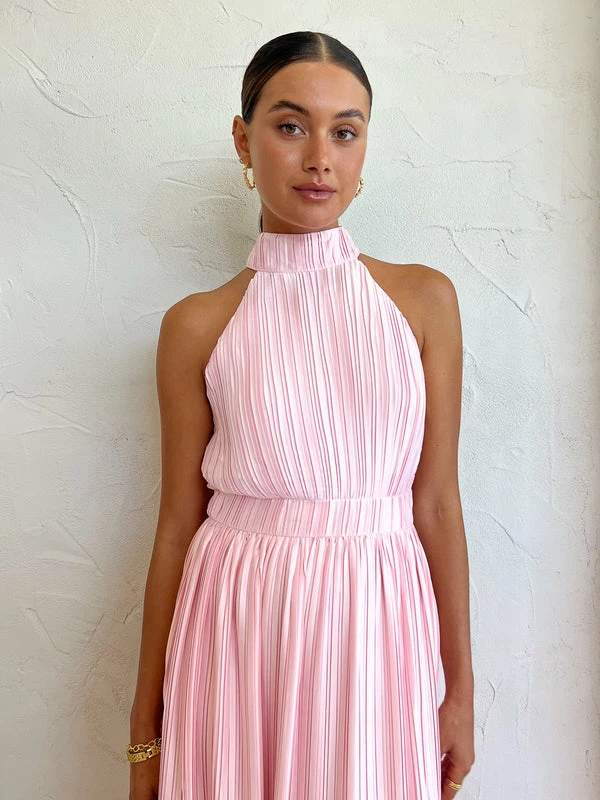 Mark your Coco Calendar with the Elia Dress in Dusty Rose by Sonya. Carefully crafted from a plisse fabric that has stretch to fit and form. this maxi dress features a high mock neckline and elasticated waist before falling to a pleated skirt silhouette. Adored for its dramatic back tie neck, feel pretty in pink at your next formal soireè, high tea or wedding celebration. DETAILS & CARE Fabric: Main 97% Polyester, 3% Spandex – Maxi length- High mock neckline- Sleek pleated dress- Invisible side zip closure- Elasticated waist- Lined skirtCare instructions: Cold Machine wash or dry clean. Do not iron, steam only.Our Coco girl Eden wears a size AU 8 / small.Eden’s height is 175 cm. COCO STYLING TIP Complete the look with the Alias Mae Mia Heel in Champagne, Amber Sceats Grande Helena Ring in Gold, Arms of Eve Eros Textured Ring in Gold, Amber Sceats Bella Earrings in Gold, Porter Chunky Belcher Bracelet in Gold and the Porter Baby Link 2.0 Bracelet in Gold.