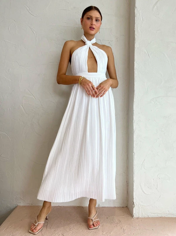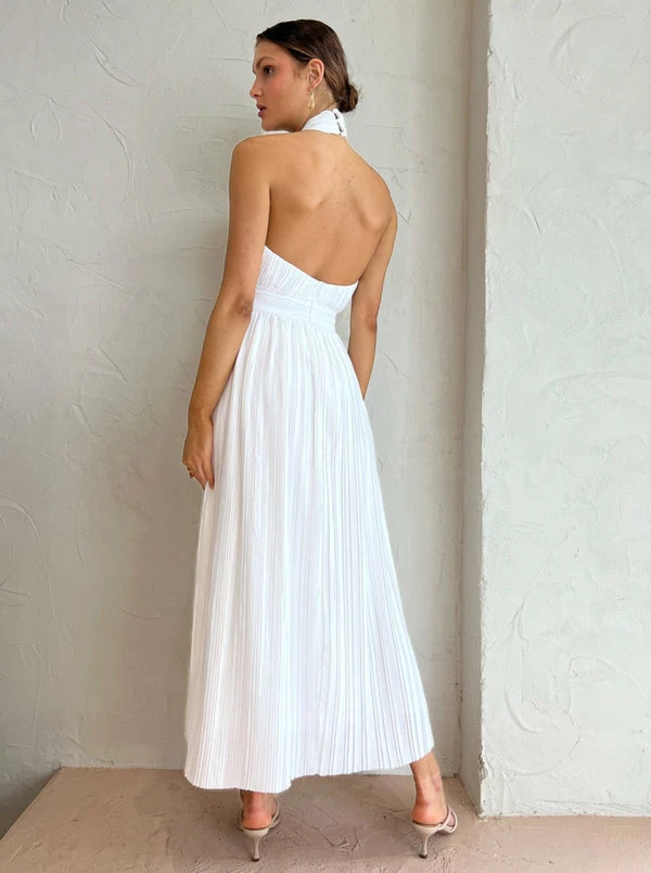 Exude romantic elegance with the Sonya Sana Pleated Maxi Dress in White. Crafted from luxurious pleated satin, this halter neck maxi dress features thick knotted straps which wrap around the neck to form a deep plunging neckline. With the fitted waistband and soft movement through the skirt, this maxi dress is perfect for engagement celebrations, cocktail occasions and summer soirees. DETAILS & CARE Fabric: 100% Polyester- Neck button closure- Invisible back zip closure- Plunging neckline- Pleated fabricCare instructions: Cold Machine wash or dry clean. Do not iron, steam only. Our Coco girl Eden wears a size 8 AU / small. Eden’s height is 175cm. COCO STYLING TIPS For special occasion styling, complete the look with the Alias Mae Baz Heels in Cream, Reliquia Telde Earrings in Gold, Porter Pond Bangle in Gold, Amber Sceats Hunter Bracelet in Gold, Porter Harp Ring in Gold, Porter Wave Ring Set in Gold, Porter Frill Cuff in Gold, Vieux Chartreaux Sunglasses in Bone and the Brie Leon Mini Chloe Bag in Natural Stone.