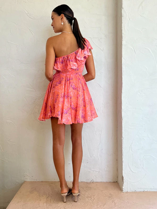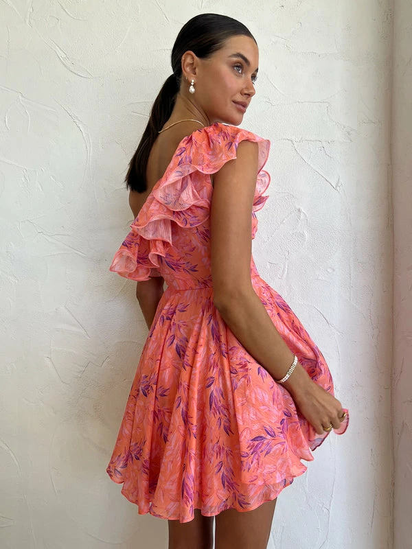 Inspired by the nature, Sonya welcomes us to the Serena Mini in Peach watercolour Print. Crafted from a silk blend fabrication, this mini dress flatters the form in a fitted off shoulder silhouette with ruffle detailing before falling into a gathered full skirt.Coveted for its feminine print, have your mini moment this season from garden parties through to birthday celebrations and seaside drinks. DETAILS & CARE Fabric: 37% Silk 63% Linen- Asymetrical shoulder – Fitted Waist- Full SkirtCare Instructions: Dry Clean Only.Our Coco girl Eden wears a size AU 8 / small.Eden’s height is 175 cm. COCO STYLING TIP Complete this special occasion look with the Alias Mae Zi Heel in Cream, Porter Celestial Choker, Amber Sceats Valletta Earrings in Gold, Amber Sceats Hunter Bracelet in Gold, Porter Chunky Belcher Bracelet in Gold, Porter Triple Heirloom Ring in Gold Amber Sceats Electra Ring Set in Gold and the Porter Pond Ring in Gold.