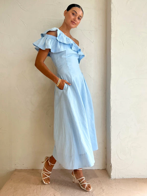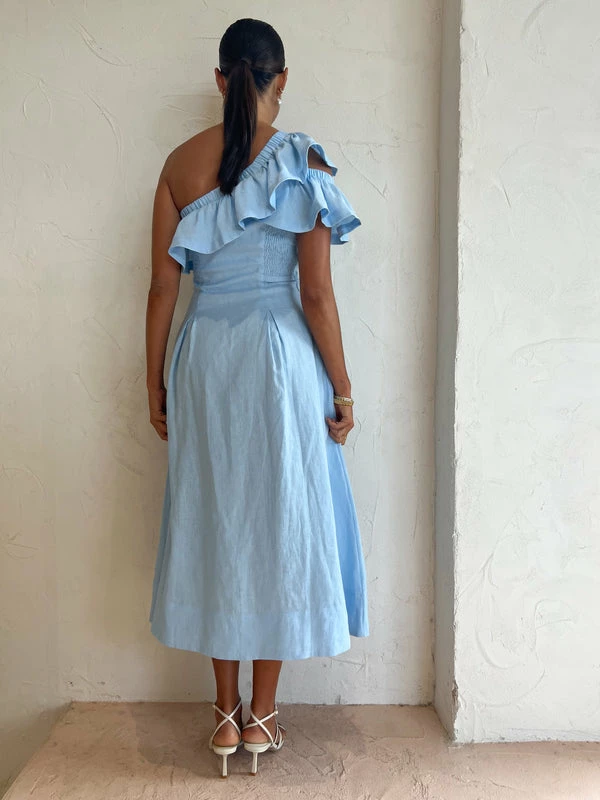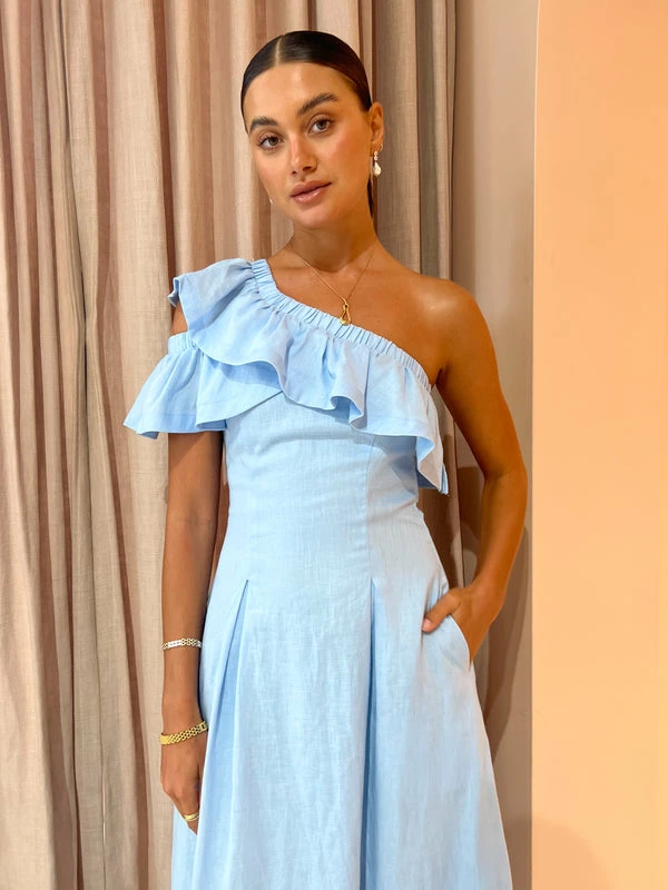 SOVERE perfectly captures summer elegance with the Promise Midi Dress in Sky Blue. Crafted from 100% luxurious linen that features a crisp light blue hue, this midi dress features an alluring asymmetric frill detail and shirred sides with hip pleats to form and flatter the femme.Adored for its sculptural asymmetric one-shoulder frills and feminine silhouette, this midi dress is perfect for wedding celebrations, birthday festivities and special weekend occasions. DETAILS & CARE Fabric: Main: 100% Linen Lining: 100% Cotton- Midi dress- Asymmetric one shoulder- Elasticated neckline- Side zipper entry- Hip pleat detail- Fully lined- Deep ruffle around neckline & right arm- Woven fabrication with no stretch Our Coco girl Eden wears a size 8 AU / small. Eden's height is 175cm. COCO STYLING TIP Finish the look with the LMS The Violet in White, Reliquia Telde Necklace in Gold, Amber Sceats Valetta Earrings in Gold, Amber Sceats Hunter Bracelet in Gold, Porter Chunky Belcher Bracelet in Gold, Porter Triple Heirloom Ring in Gold, Amber Sceats Electra Ring Set in Gold and the Porter Pond Ring in Gold.