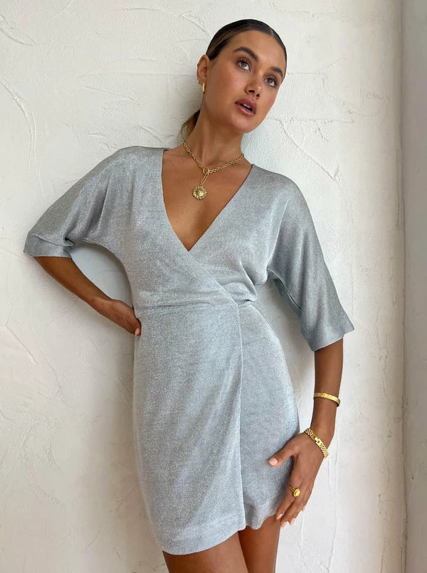 Glisten under the moonlight with Third Form's bespoke Heavy Metal Knit Wrap Dress in Silver. Crafted from a heavyweight Silver Lurex blend, this wrap style mini dress sits relaxed on the body. Flattering the décolletage with a V necklace, it features relaxed mid-length sleeves with exposed seams. Perfect for date night and twilight cocktails, its alluring silhouette will have you under the spotlight all night long. DETAILS & CARE Fabric: 65% Viscose 35% Lurex – Wrap front with adjustable back tie – Mini length – V neckline – Exposed seams – Mid-length sleeves Care Instructions: Delicate hand wash. Our Coco girl Eden wears a size AU 8 / small. Eden’s height is 175cm. COCO STYLING TIP Complete this glamorous ensemble with the Alias Mae Zi Heel in Cream, the Amber Sceats Hunter Bracelet in Gold, Arms of Eve Helios Cuff Bracelet in Gold, Porter Wave Ring Set in Gold and Reliquia Sevilla Earrings in Gold.