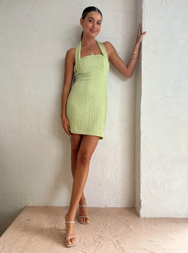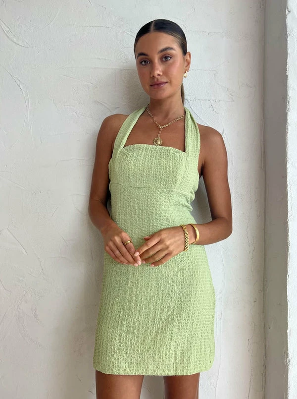 Third Form reminisce on 90s party dressing with the refreshing Waffle Halter Mini Dress in Mint. Designed to be fitted, this high stretch mini dress flatters and contours the body. Cut with a square neckline and fastening halter straps and a centre back zip closure. It's soft Waffle texture is complimented in a Mint hue perfect for trans-seasonal cocktail occasions, birthday celebrations and garden party fesitvities. DETAILS & CARE Fabric: 95% Polyester 5% Spandex – Self-fastening halter straps – Mini length – Fitted – Square neckline – Strapless bra friendly Care Instructions: Cold hand wash. Our Coco girl Eden wears a size AU 8 / small. Eden’s height is 175cm. COCO STYLING TIP Glamourise this mini moment with the Alias Mae Zi Heel in Cream, the Amber Sceats Hunter Bracelet in Gold, Arms of Eve Helios Cuff Bracelet in Gold, Porter Wave Ring Set in Gold and Reliquia Sevilla Earrings in Gold.
