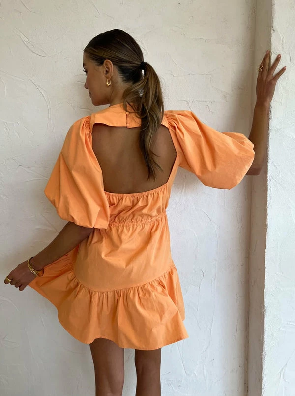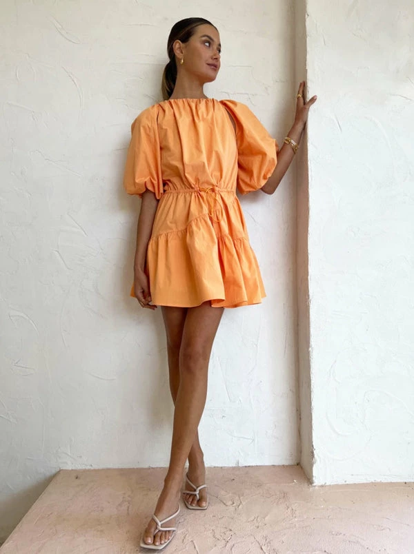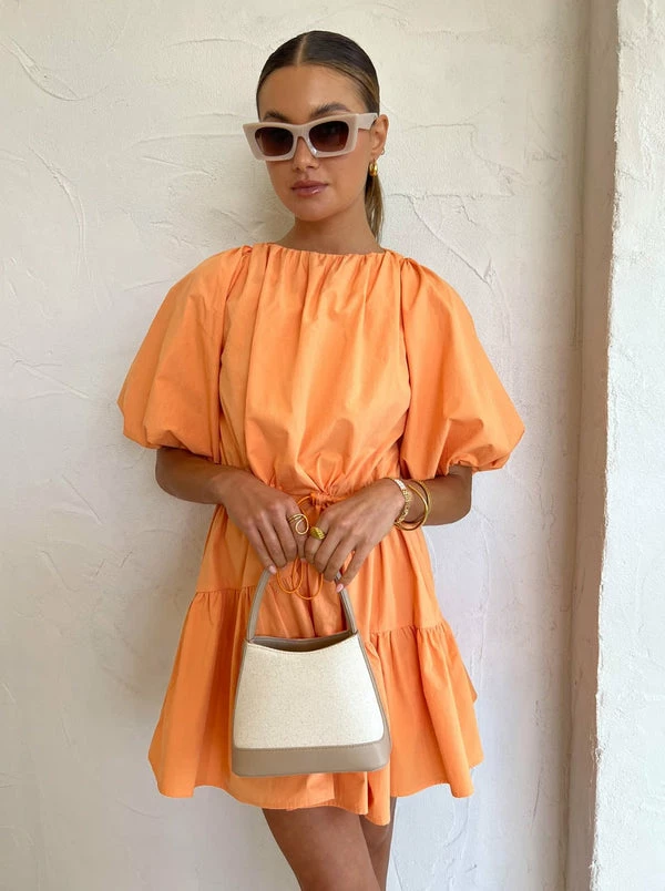 Sweeten Summer occasions with the Jaffa hue and babydoll silhouette of the Alita Dress from TOJHÀ. Crafted from Cotton, this mini dress sits relaxed on the body. Cut with a round neckline, it features exaggerated puff sleeves, asymmetric gathers in the skirt and cut outs at the front shoulders. Signature elastic toggles at the waist fasten to accentuate the femme waist, embodying effortless confidence for your birthday celebrations and long lunch occasions. DETAILS & CARE Fabric: 100% Cotton – mini length – Elasticated waist with adjustable toggles – Puff sleeves – Cut outs at front shoulders – Open back with elastic details – Self-covered functional buttons at back neckline Our Coco girl Eden wears a size AU 8 / small. Eden’s height is 175cm. COCO STYLING TIP Complete the look with the James Smith Medena Sandal in Nude, Brie Leon Mini Chloe Bag in Natural Stone, Porter Harp Ring Gold, Porter Wave Ring Set in Gold, Porter Frill Cuff in Gold, Amber Sceats Hunter Bracelet in Gold, Reliquia Telde Earrings in Gold, Porter Pond Bangle in Gold, Vieux Chartreaux Sunglasses in Bone and the Reliquia Telde Necklace in Gold.