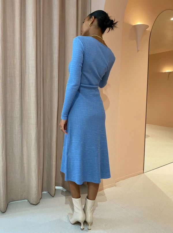 The Viktoria and Woods Aperol Dress in Thunder Marl celebrates sophisticated styling in an understated blue hue. Crafted from a signature Cotton Marle fabrication, this ribbed midi dress is designed to perfectly skim and flatter the body. Featuring a square neckline to highlight the décolletage, full length sleeves and curved paneling to accentuate the bust before softly falling into a flowing midi skirt. Designed to be worn with comfort, the Aperol Dress will be the perfect pairing for desk to date night occasions. DETAILS & CARE Fabric: 57% Cotton, 42% Polyester, 1% Elastane- Marled rib- Square neckline- Curved paneling under bust – Midi-length- Full length sleeves – Slight stretch- Mid-weight Care Instructions: Cold hand washOur Coco girl Boston wears a Size V&W Size 1 / 8 / Small.Boston's Height is 178cm COCO STYLING TIP Complete this chic midi moment with Alias Mae Lani Boot in Cream, Porter Horn Hoops in Gold, Arms of Eve Rae Chain Necklace in Gold and Porter Mali Ring Set in Gold.