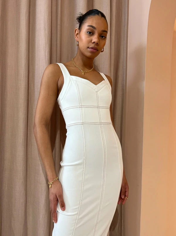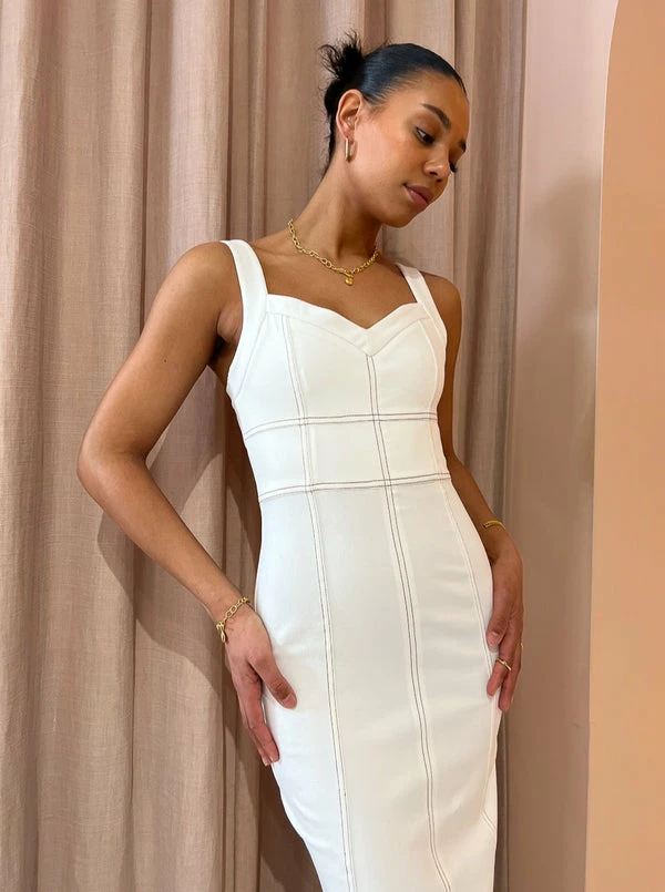 Viktoria & Woods Aquatic Dress in Ivory is a coveted silhouette for versatile styling all year round. Thoughtfully crafted from an Ivory stretch denim, this midi dress is designed to sit fitted and features a subtle V-neckline and contrast twin needle stitching to add an elevated touch. With day to night comfort, the Aquatic Dress will be your go-to for long lunches, twilight cocktails and engagement parties. DETAILS & CARE Fabric: 98% Cotton, 2% Elastane – Midi length- Sweetheart neckline- Contrast twin needle stitching- Invisible zipper at centre back- Centre back split Care Instructions: Cold hand wash. Dry flat in shade. Cool iron. Our Coco girl Boston wears a V&W Size 1/ 8 / Small Boston’s height is 178cm. COCO STYLING TIP Complete with Alias Mae Cassie Heel in Natural, Reliquia Lucille Earrings in Gold, Amber Sceats Coco Necklace in Gold, Porter Frill Cuff in Gold, Amber Sceats Coco Bracelet in Gold, Porter Frill Cuff in Gold and Porter Wave Croissant Ring in Gold.