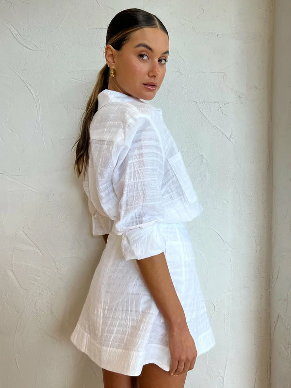 Viktoria & Woods revive the 90s mini skirt with their signature minimalistic touch in the Coterie Skirt in White stripe. Delicately crafted from a Silk Viscose blend in a textured White Stripe. This high waist A line mini skirt sits relaxed on the body with a wide waistband, centre back zip closure and exaggerated pockets at the front and back. Elevated in design, the Coterie Skirt in a season-less investment you'll wear on repeat Monday to Sunday. DETAILS & CARE Fabric: 65% Viscose 35% Silk – Thick grown on waistband with top stitching – Oversized pickets that wrap to back patch pockets – A-line silhouette – Fully lined – Centre back invisible zipper – Relaxed fit Care Instructions: Dry clean only. COCO STYLING TIP Complete the look with the Viktoria & Woods Evergreen Shirt in White Stripe, the Alias Mae Baz Heels in Cream, the Porter Spiral Hoops in Gold, the Porter Pond Bangle in Gold, the Amber Sceats Hunter Bracelet in Gold, the Reliquia Serpa Necklace in Gold/Pearl, the Reliquia Thalia Ring in Pearl/ Gold, the Porter Wave Ring Set in Gold, Porter Pond Ring in Gold and the Arms of Eve Helios Cuff Bracelet in Gold.