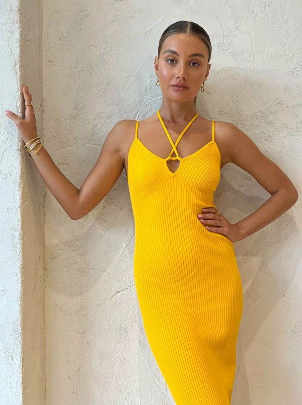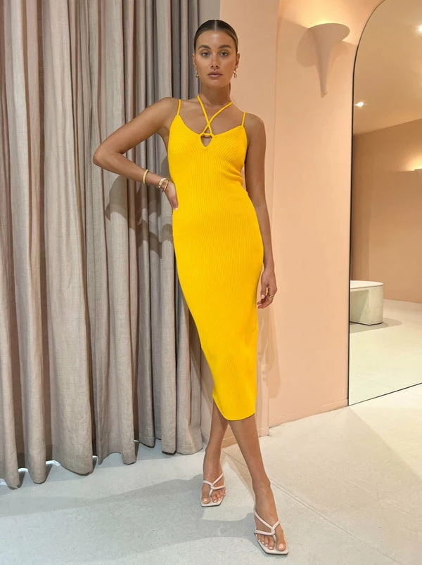 Stand out from the crowd with the bright and bold Reynolds Dress in Mango from VIKTORIA & WOODS. Crafted from the brands quintessential ribbed knit fabrication, this midi dress is designed to form and flatter and features a deep V-neckline that finishes with halter straps that can be worn multiple ways.Celebrate sunshine styling with this form fitting knit dress for your next wedding soiree, sunset drinks or your special birthday celebration. DETAILS & CARE Fabric: Main 65% Viscose, 35% Nylon- Ribbed knit construction with fashioning at front bust- Halter strap detail can be worn multiple ways- V-shape neckline- Mid-lengthCare Instructions: Cold hand wash, lay flat in shade.Our Coco girl Eden wears a size AU 8 / small.Eden's height is 175cm. COCO STYLING TIP Complete this special occasion look with the Alias Mae Baz Heels in Cream, Porter Harp Ring in Gold, Porter Wave Ring Set in Gold, Reliquia Thalia Ring in Pearl/Gold, Porter Frill Cuff in Gold, Amber Sceats Hunter Bracelet in Gold, Porter Pond Bangle in Gold and the Porter Pond Earrings in Gold.